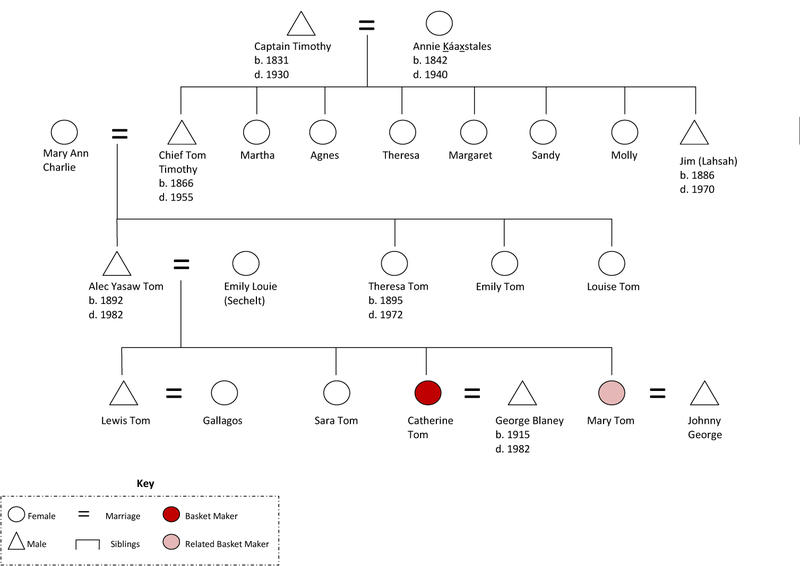 Basket maker Catherine (Tom) Blaney's father, Alec Yasaw Tom, was the eldest son of Sliammon Chief Tom Timothy. Sliammon people did not immediately adopt the surname customs of the British. Instead, Sliammon families often chose to use a father's first name as the surname of his children. Hence the sons and daughters of Chief Tom Timothy had Tom, rather than Timothy as their surname.