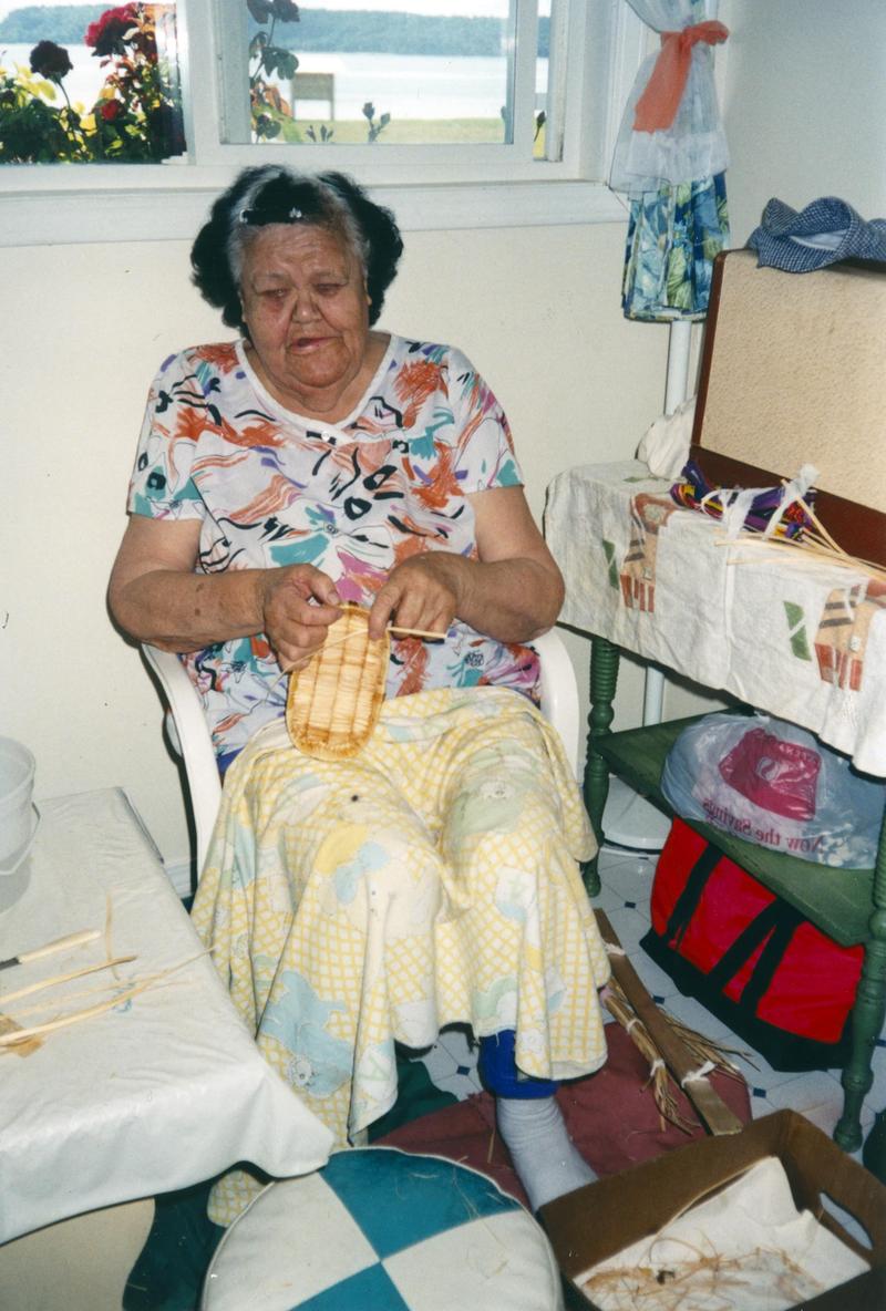 Later in life Catherine began to loose her sight, but even failing vision did not stop her from making baskets. She particularly enjoyed getting together with her sister Mary (George) and Agnes Mcgee for communal basket making sessions. Her grand nephew Steve Vivier fondly remembers the gatherings that took place after Catherine's sight was almost completely gone, Catherine building basket bottoms and passing them over to one of the others to finish. When a young person in the family got married, the group of basket makers would get together to make the newly wed couple a set of baskets. The baskets pictured here are part of a set made for Steve Vivier. Made during Catherine's later years they are not representative of her work when she was sighted.