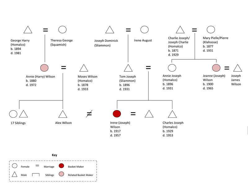 Irene was the daughter of Annie Joseph of Church House and Tom Joseph of Sliammon. Irene's maternal grandparents were Joseph Charlie and Mary Pielle (who appears in some records as Mary Pierre). Her paternal grandparents were Joseph Dominick and Irene August.